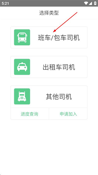 1、進入選擇類型界面,找到班車/包車司機選項,點擊該選項進入對應的登錄頁面。