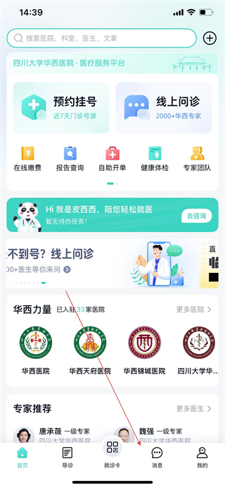 1、打開華西通APP,在首頁點擊預約掛號選項。
