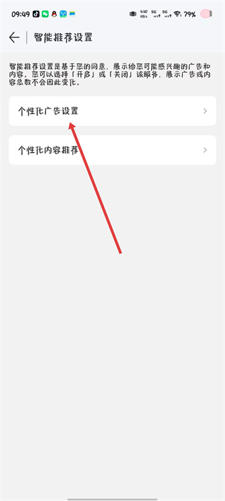 3、在智能推薦設置頁面點擊個性化廣告設置,進入對應的設置界面。