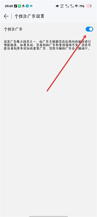 4、在個性化廣告設置頁面,找到個性化廣告對應的開關,點擊開關關閉。