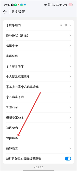 2、在更多設置列表中選擇智能推薦選項,進入智能推薦設置頁面。