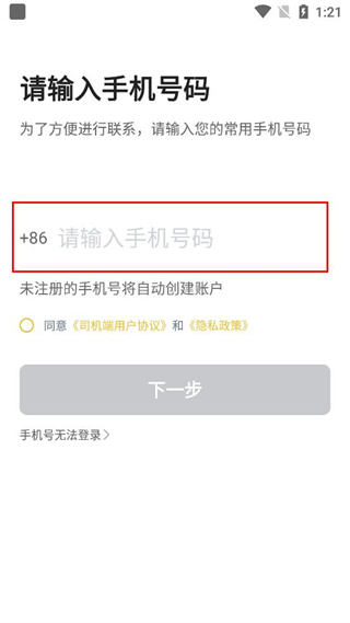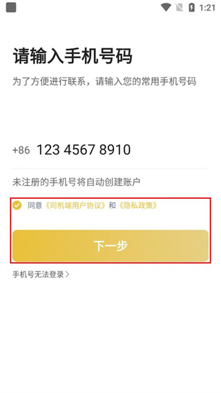 3、勾選同意司機端用戶協議和隱私政策選項,點擊頁面中的下一步按鈕,繼續完成登錄流程。