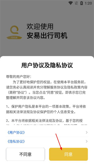 1、打開安易出行司機端應用,出現用戶協議及隱私協議彈窗后,點擊彈窗中的同意按鈕,進入手機號輸入頁面。