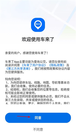 1、打開車來了APP,查看彈出的用戶協議及隱私政策,點擊同意按鈕進入主界面。
