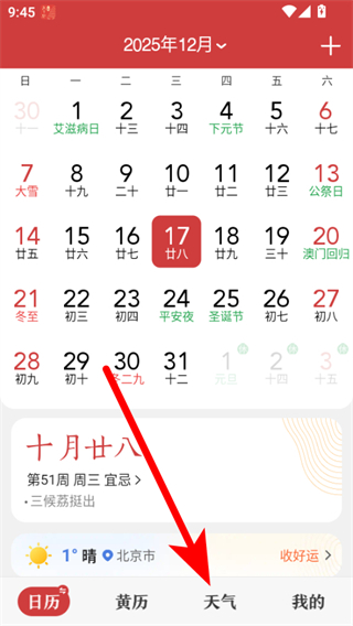 1、打開中華萬年歷app,在主界面點擊底部的天氣選項,進入天氣頁面。