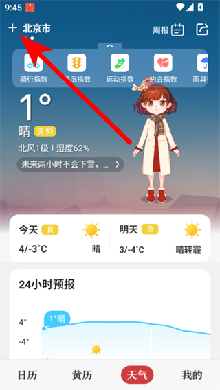 2、在天氣頁面點擊左上角的+北京市區域,進入城市管理相關頁面。