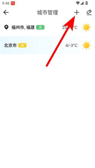3、在城市管理頁面點擊右上角的+按鈕,進入添加城市的操作頁面。