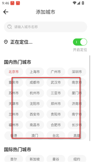 4、在添加城市頁面,從國內熱門城市列表中選擇要添加的城市,即可完成選擇。
