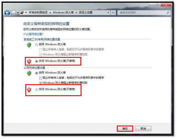 關閉系統防火墻:進入電腦【控制面板】→【WINDOWS防火墻】→【打開或關閉WINDOWS防火墻】→【關閉防火墻】。