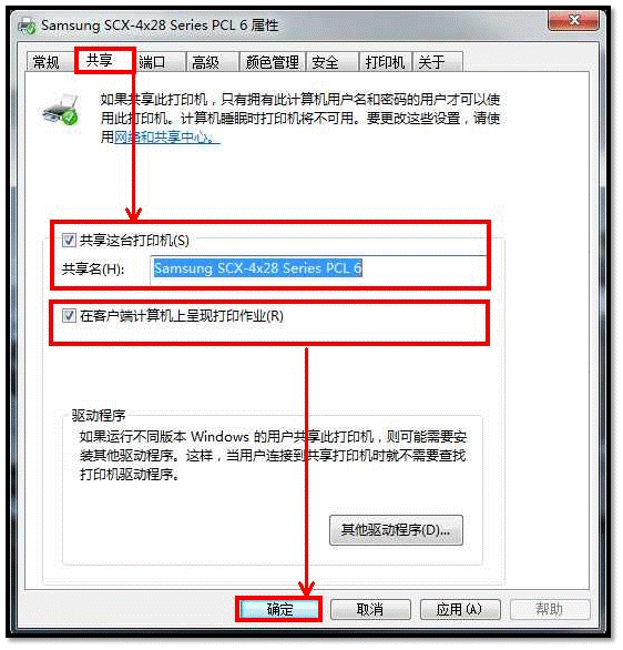 3.右鍵單擊打印機圖標,選擇【打印機屬性】→【共享】→【共享這臺打印機】和【在客戶端計算機上呈現打印作業】都畫鉤,然后再按【確定】。