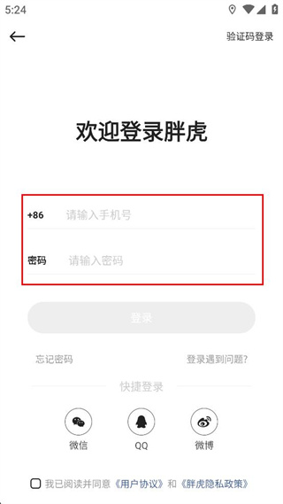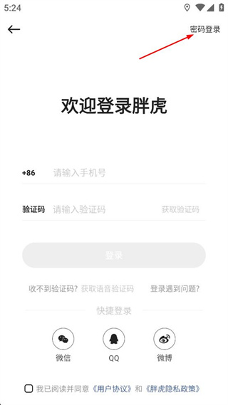 3、在個人頁面中,找到登錄入口并點擊,進入歡迎登錄胖虎界面后選擇密碼登錄選項。