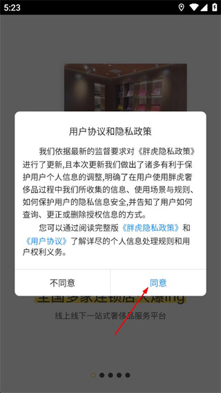 1、打開胖虎奢侈品軟件,看到用戶協議和隱私政策彈窗,點擊彈窗里的同意按鈕,完成協議確認。