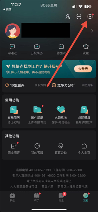 1、打開BOSS直聘APP,進入我的頁面后點擊右上角設置圖標。