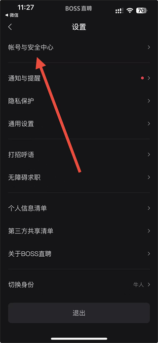 1、打開Boss直聘app進入我的的頁面,點擊右上角齒輪形狀的設置圖標,在設置列表中找到并點擊賬號與安全中心。