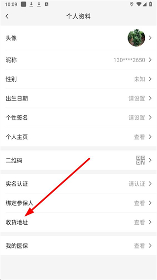 3、在展示頭像、昵稱等信息的個人資料頁面,找到收貨地址選項并點擊,進入收貨地址管理頁面。
