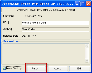 2、復制補丁至安裝目錄(C:\Program Files\CyberLink\PowerDVD13),右鍵管理員運行,打開后點Patch完成。