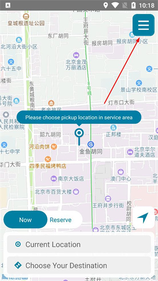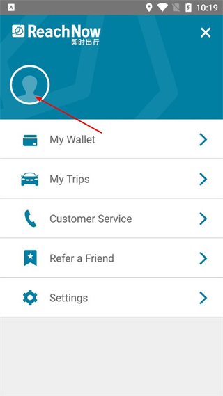 1、打開ReachNow即時出行應用,點擊界面右上角的菜單按鈕,進入功能選擇頁面。