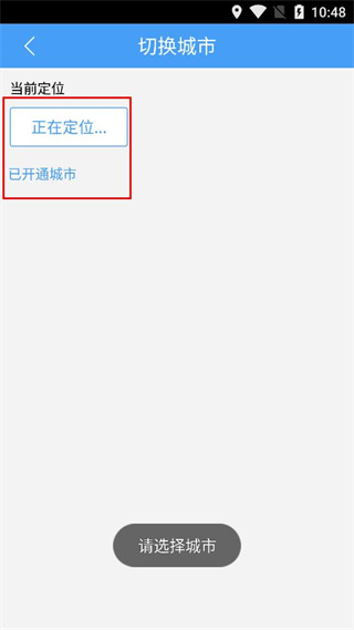 2、在切換城市頁面中,等待系統完成當前定位,確認已開通城市的相關信息。