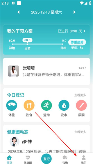 1、打開體重管家首頁,點擊底部導航欄的我的選項,進入個人中心界面。