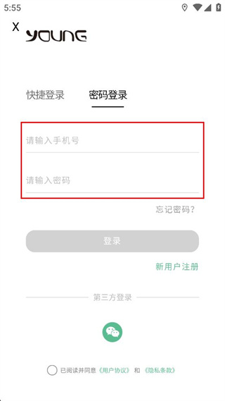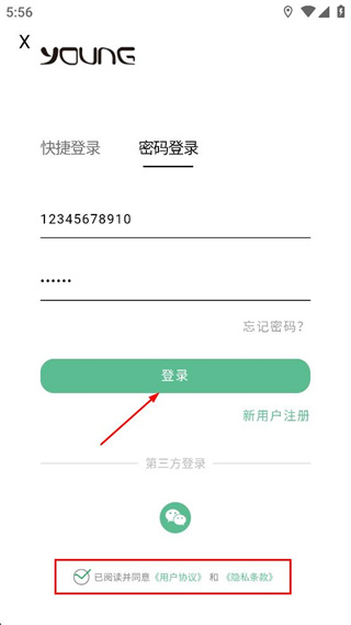 3、進入密碼登錄界面,在對應輸入框填寫手機號和密碼信息,勾選相關協議內容。