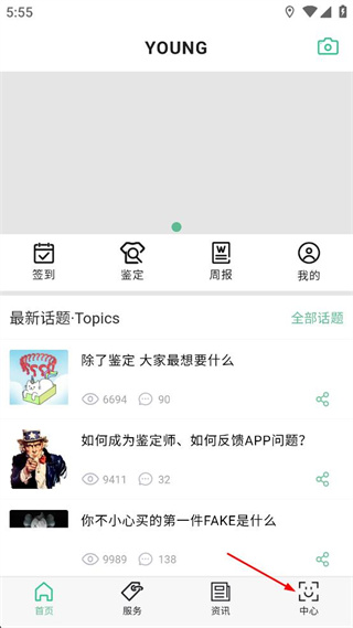 1、打開YOUNG軟件,進入首頁后找到下方功能欄里的中心選項,點擊該選項進入對應頁面。