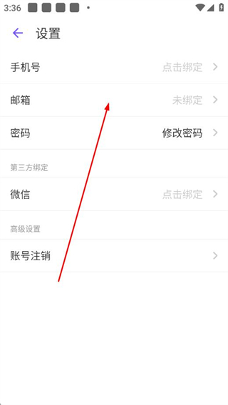 4、在賬號綁定頁面點擊郵箱選項,進入綁定郵箱頁面。