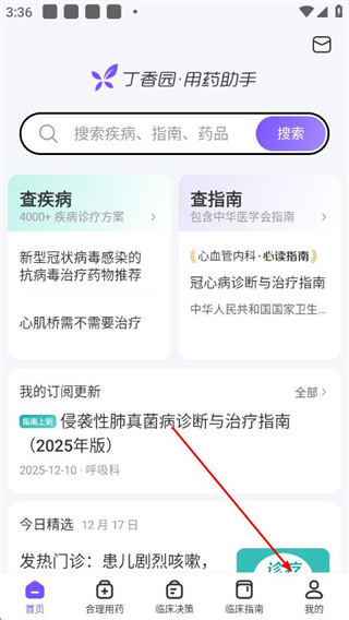 打開用藥助手App,搜索疾病名,即可查看對應診療方案、臨床指南。