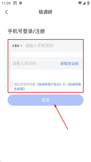 3、在登錄界面輸入手機號碼,獲取并輸入驗證碼,勾選協議,點擊登錄。