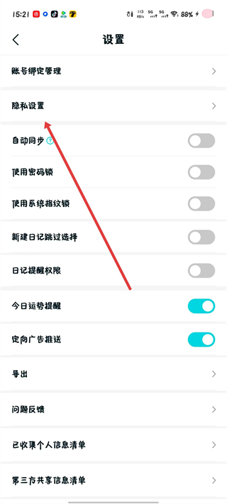 2、在設置頁面中找到隱私設置選項,點擊該選項進入隱私設置界面。