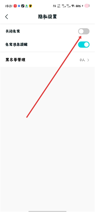 3、在隱私設置界面里找到關閉兔窩開關,點擊后彈出確認提示窗口。
