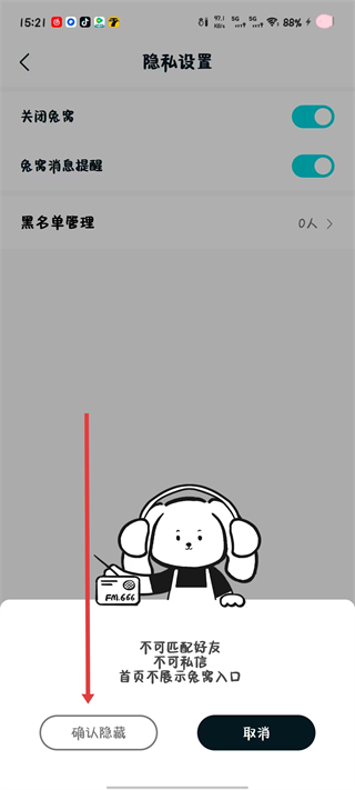 4、在提示窗口中點擊確認隱藏按鈕,即可完成兔窩功能的關閉操作。