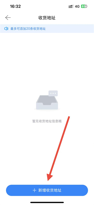 3、在收貨地址頁面,點擊底部新增收貨地址按鈕,進入地址填寫界面。