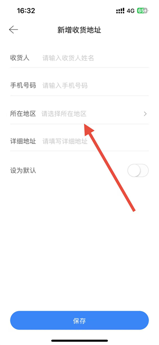 4、在新增收貨地址頁面,依次填寫詳細地址等信息,確認后點擊保存完成地址添加。