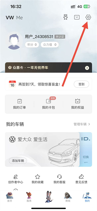 1、在一汽大眾我的個人頁面,點擊右上角的設置圖標,進入設置頁面。