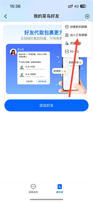 3、在我的菜鳥好友界面點擊右上角的圖標,選擇加入已有群聊選項。