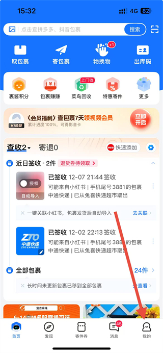1、在菜鳥app首頁點擊我的選項,進入個人頁面。