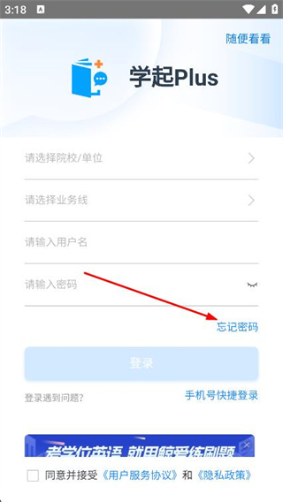 1、打開學起Plus登錄頁面,找到并點擊下方的忘記密碼選項。