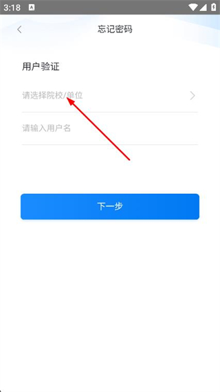 2、在忘記密碼的用戶驗證頁面,點擊請選擇院校/單位選項。