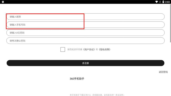3、在登錄頁面,點擊輸入框輸入昵稱和手機號。