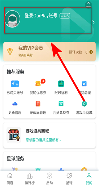 2、在個人中心界面,點擊登錄OurPlay賬號區域,進入登錄/注冊頁面。