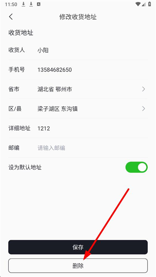 4、在修改收貨地址頁面,點擊底部刪除按鈕,確認操作后即可完成該地址信息的刪除。