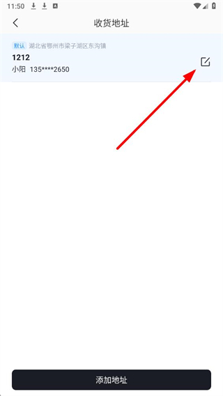 3、在收貨地址界面,點擊目標地址右側的編輯圖標,跳轉至修改收貨地址的操作頁面。