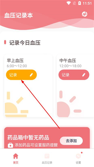 1、打開血壓記錄本app首頁,選擇對應時段,點擊記錄,進入血壓記錄頁面。