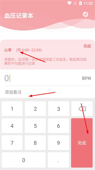 4、在心率頁面,輸入測量的心率數值,可添加備注,點擊完成。