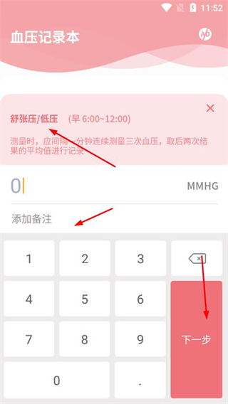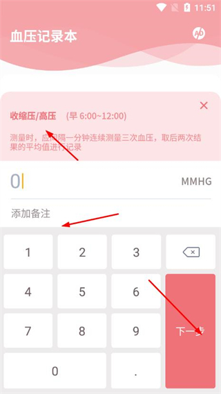 2、在收縮壓/高壓頁面,輸入測量的收縮壓數值,可添加備注,點擊下一步。