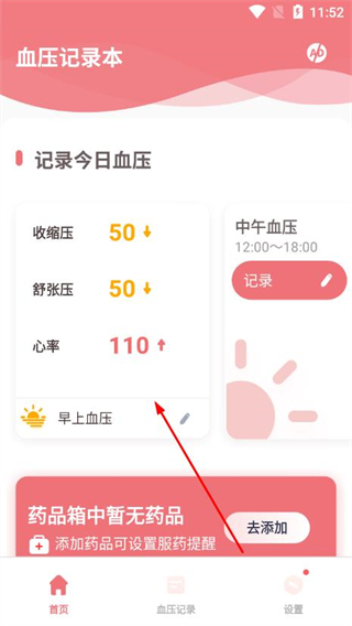 5、完成后,首頁會顯示已記錄的對應時段血壓數據。