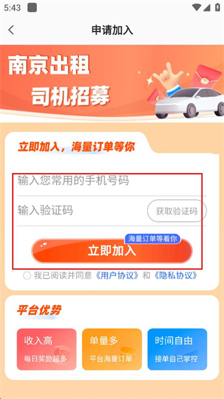 4、進入申請加入頁面,填寫常用手機號碼和驗證碼,勾選協議后點擊立即加入按鈕。