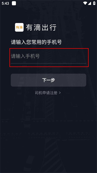 2、進入有滴出行的手機號輸入頁面,找到請輸入手機號輸入框,準備填寫常用手機號。