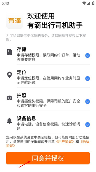 1、查看有滴出行司機助手的權限申請內容,確認后點擊同意并授權按鈕,完成權限授予。