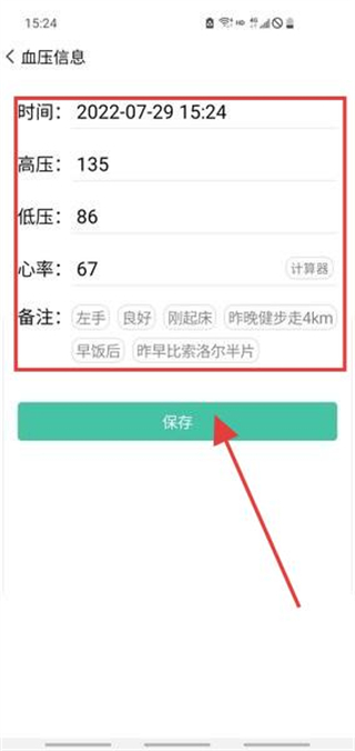 2、在血壓信息頁面,填寫時間、高壓、低壓、心率及備注信息后,點擊保存。